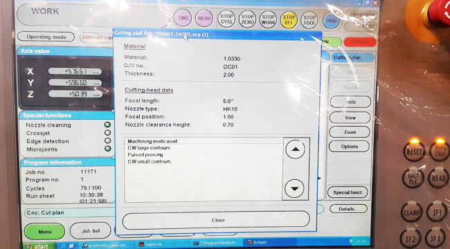 Bystronic BySpeed Pro 4400W lazerin kullandığı gazı  Lazer 7 olarak tanımlamıştır. Malzemenin cinsine, kalınlığına göre ışın çapı değişmekte ve oluşan ışın, bilgisayar sistemi ile ayarlanabilen aynalar vasıtasıyla tezgahın kesme kafasına kadar yansıtılarak getirilmektedir.